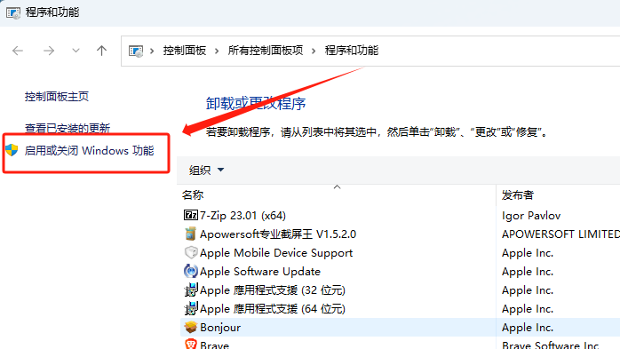 在左侧面板中,单击“启用或关闭Windows功能”,这将打开​窗口。