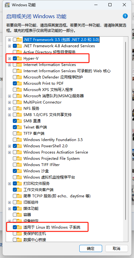 如图所示,勾选【Hyper-V】和【适用于Linux的Windows子系统】后重启电脑。